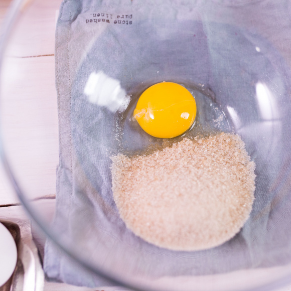 Аккуратно отделяем желток от белка. Переливаем желток в ёмкость для взбивания, добавляем сахарный песок и взбиваем на средней скорости миксера до полного растворения сахара.