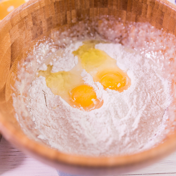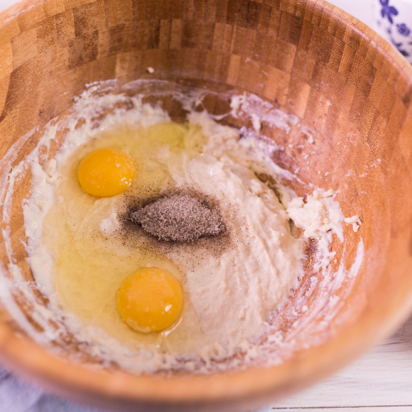 В получившееся тесто разбиваем 2 крупных яйца комнатной температуры, перемешиваем до однородной массы.