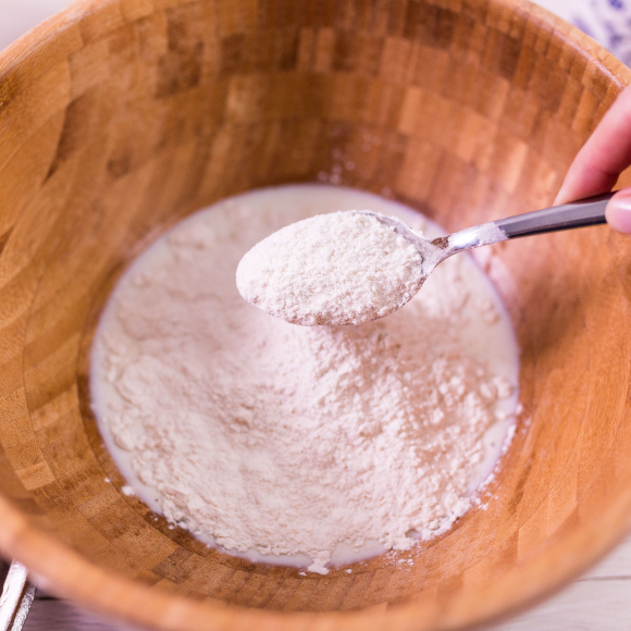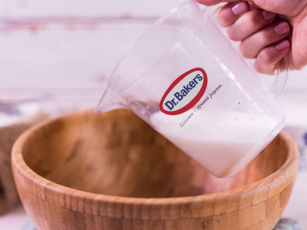 При помощи ложки либо лопатки вводим в молоко половину мучной смеси. Смесь желательно вводить небольшими порциями, чтобы избежать возникновения комочков.