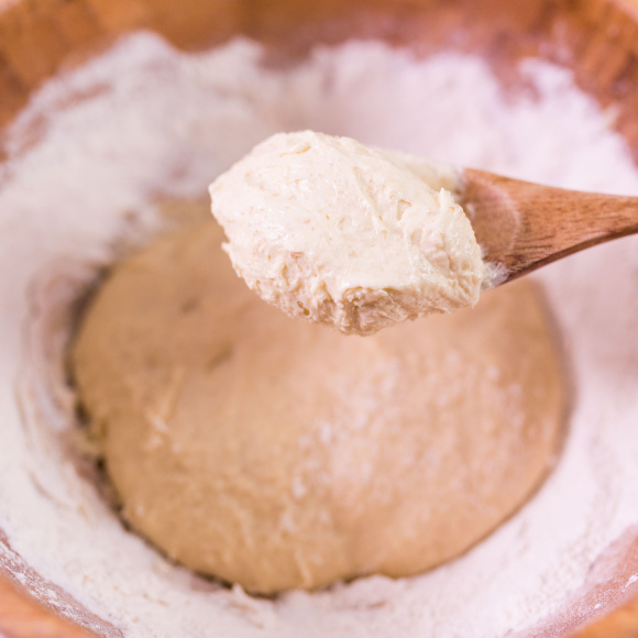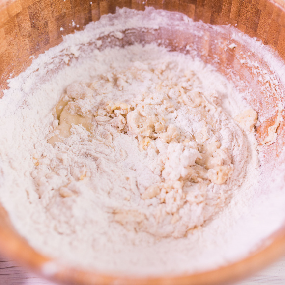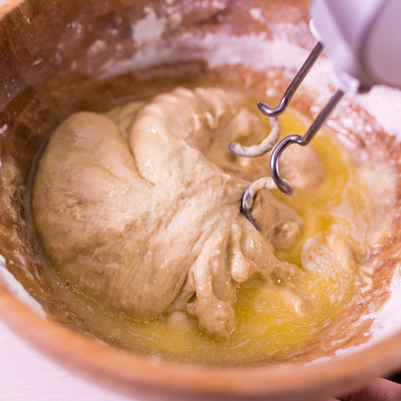 Замешиваем тесто, постепенно добавляя к нему вторую половину мучной смеси. Предпочтительнее делать это лопаткой в миске, не перекладывая тесто на рабочую поверхность.
