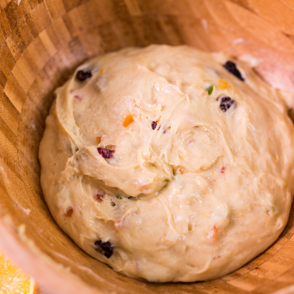 Тщательно вымешиваем до тех пор, пока изюм, цедра и цукаты не распределятся равномерно по всему тесту.