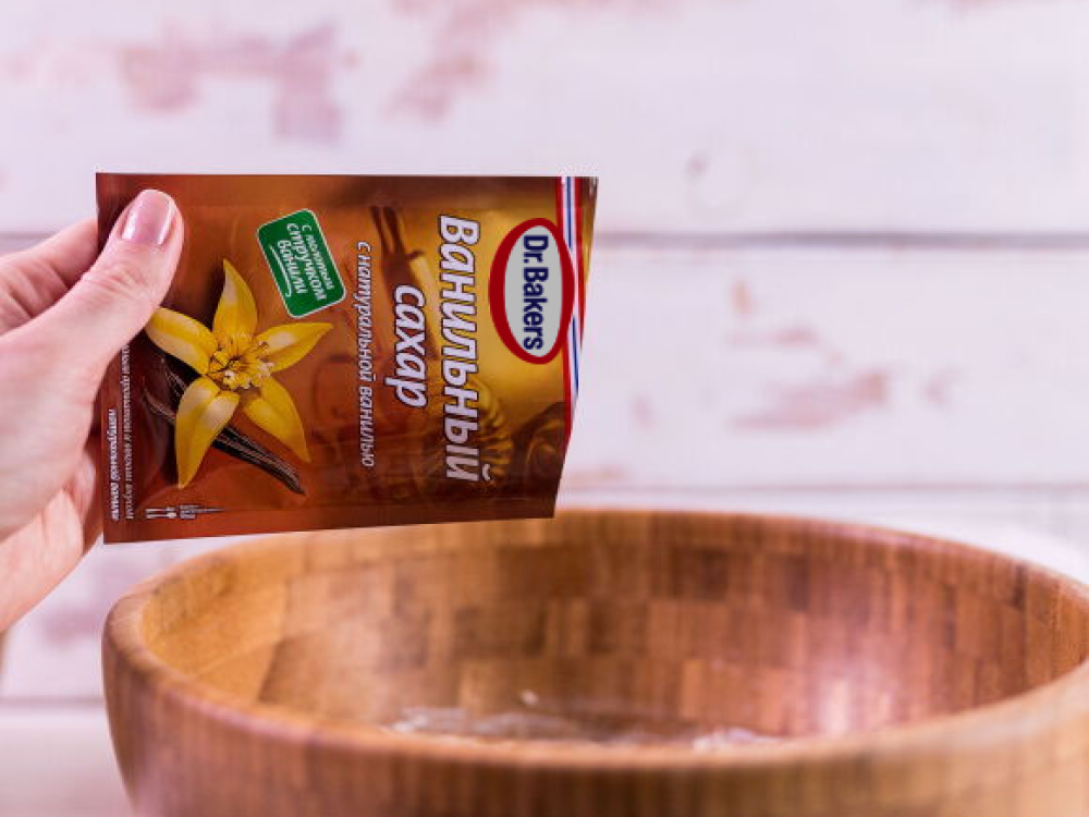 Всыпаем ванильный сахар и ещё раз всё перемешиваем. Добавляем 1 щепотку поваренной соли.