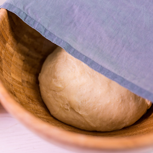 Берём большую и глубокую ёмкость, смазываем дно и стенки растительным маслом, аккуратно перекладываем в неё тесто, накрываем пищевой пленкой и оставляем в тёплом месте примерно на 1.5 часа, давая тесту подняться.