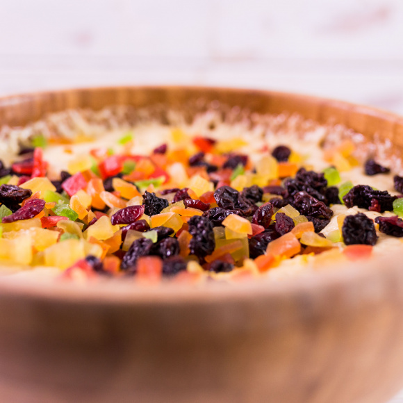 Заливаем изюм кипятком на 3-5 минут, затем промываем проточной водой, откидываем на сито, после чего сушим с помощью бумажного полотенца. Если цукаты крупные, измельчаем их ножом на одинаковые кусочки. Добавляем изюм и цукаты в тесто.