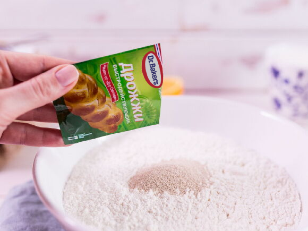 В глубокую миску просеиваем муку высшего сорта, добавляем к ней сухие дрожжи и перемешиваем.