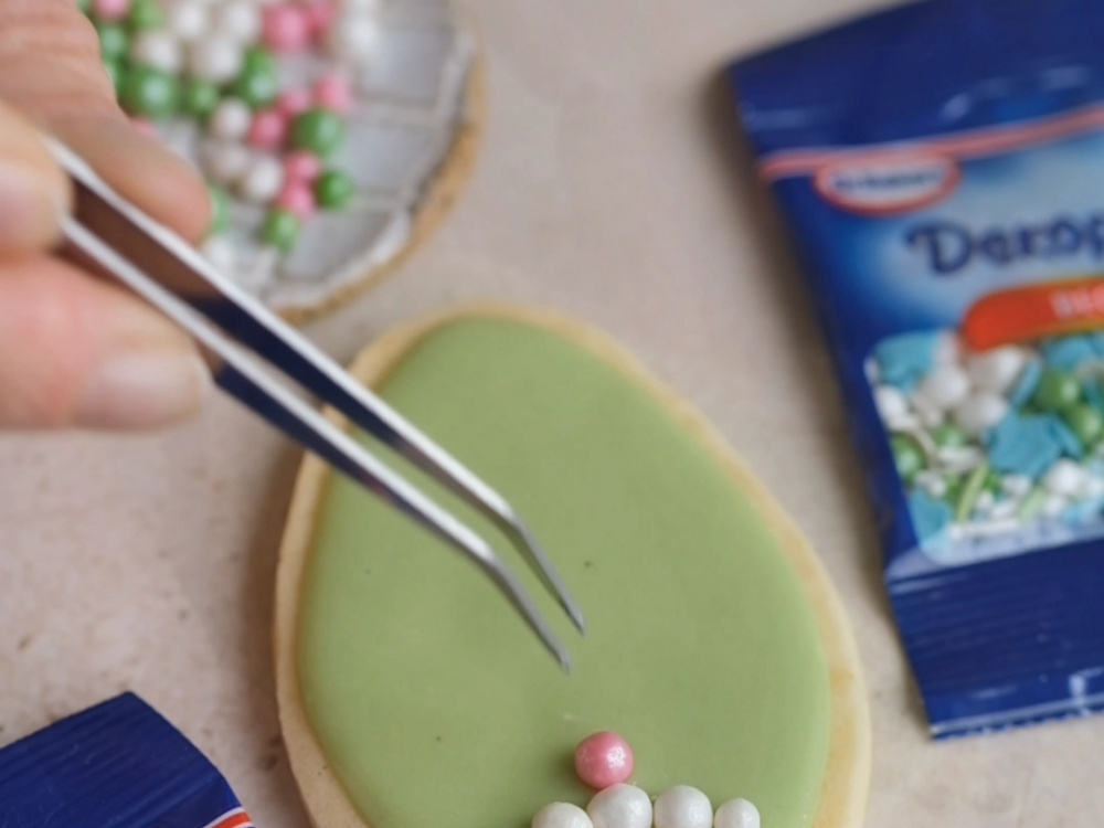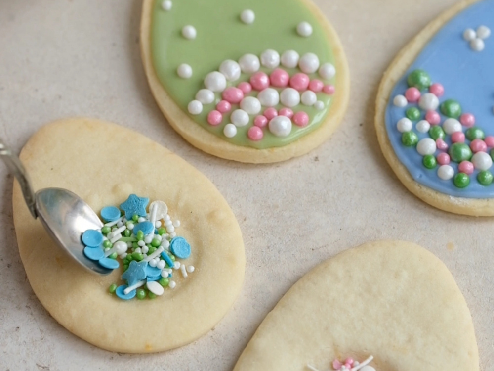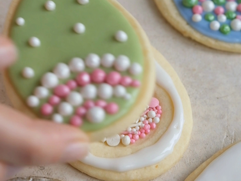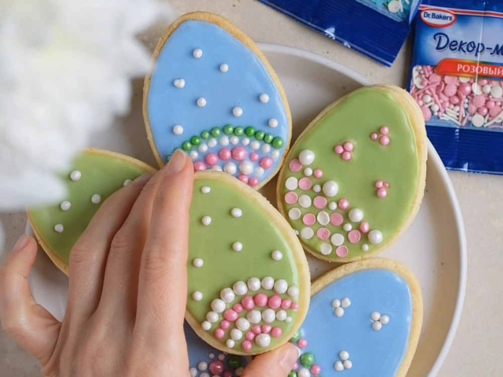 После того как печенье остыло, одну из половинок с ровной стороны покрываем голубой или зелёной глазурью. Пока она не застыла, украшаем посыпкой и даём глазури полностью застыть.