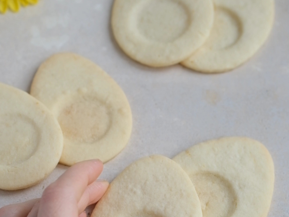 С помощью формочки вырезаем печенье и переносим его на противень, застеленный пергаментом. С помощью ложки делаем углубление на всех печеньках.