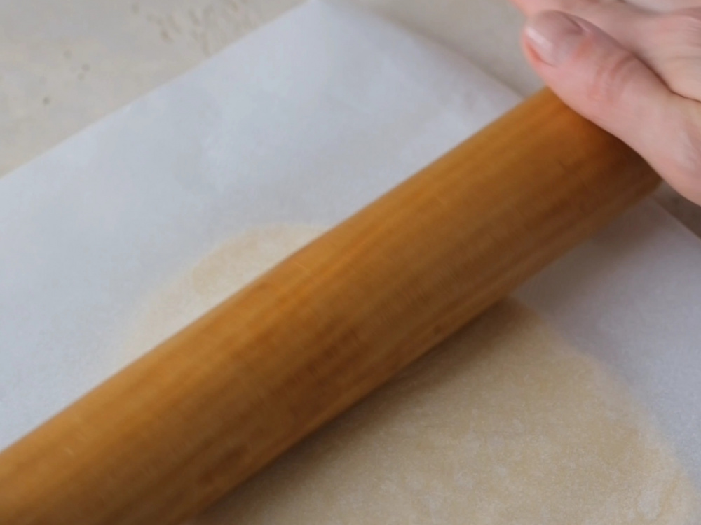 Раскатываем тесто между двумя листами пергамента либо на припылённой мукой поверхности толщиной 5–8 мм.