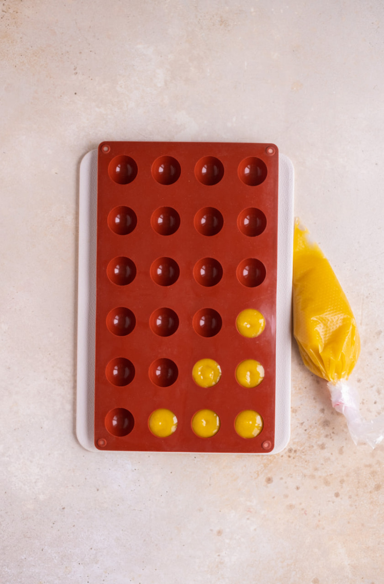 Помещаем начинку в кондитерский мешок и заполняем ею ячейки формы полусферы. Диаметр ячеек должен быть 3-3,5 см. Разравниваем, накрываем плёнкой в контакт и убираем в морозилку до момента использования.