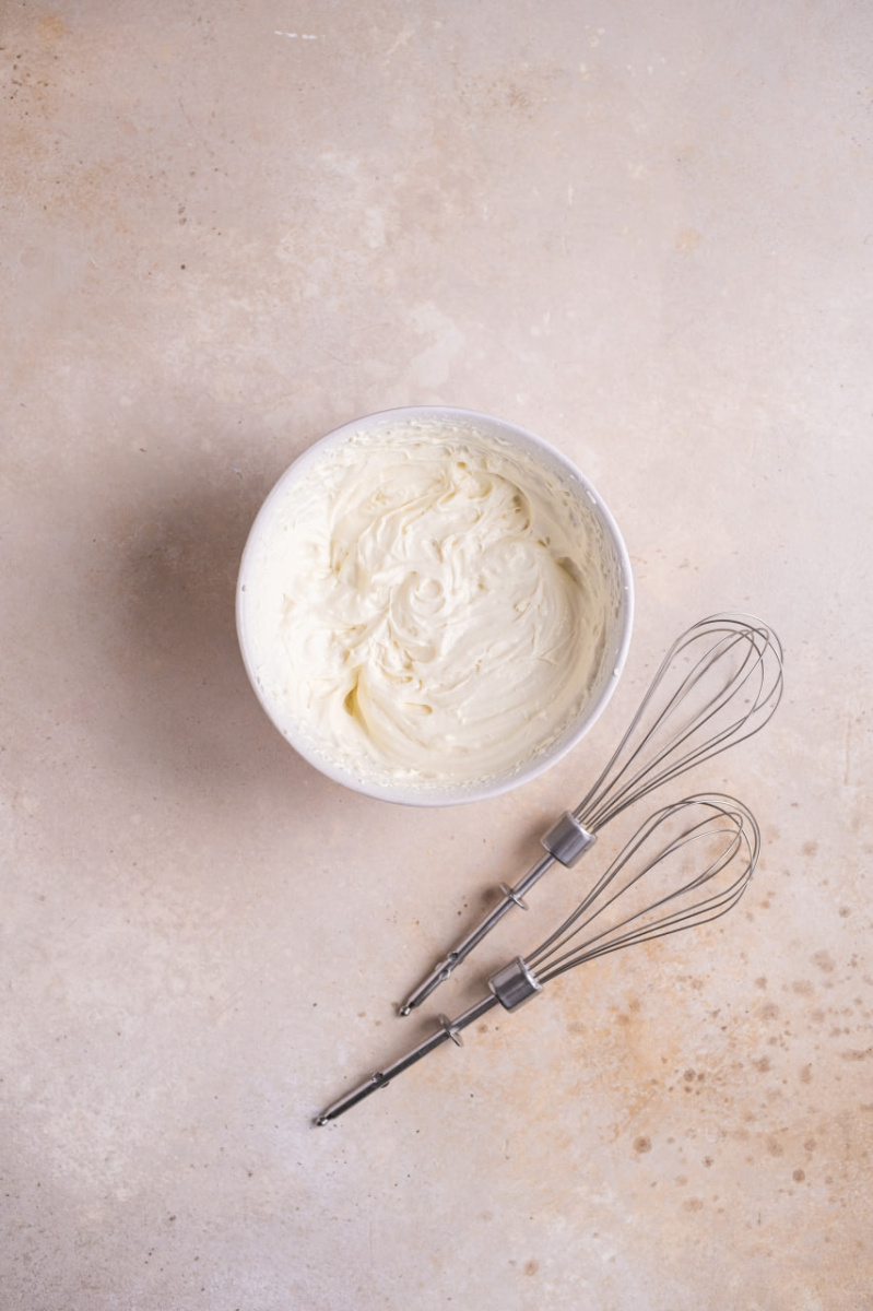 Ванильный ганаш достаём из холодильника и взбиваем на средней скорости миксера 2 минуты (будьте внимательны, этот ганаш легко перевзбить!). Перекладываем взбитый ганаш в кондитерский мешок.