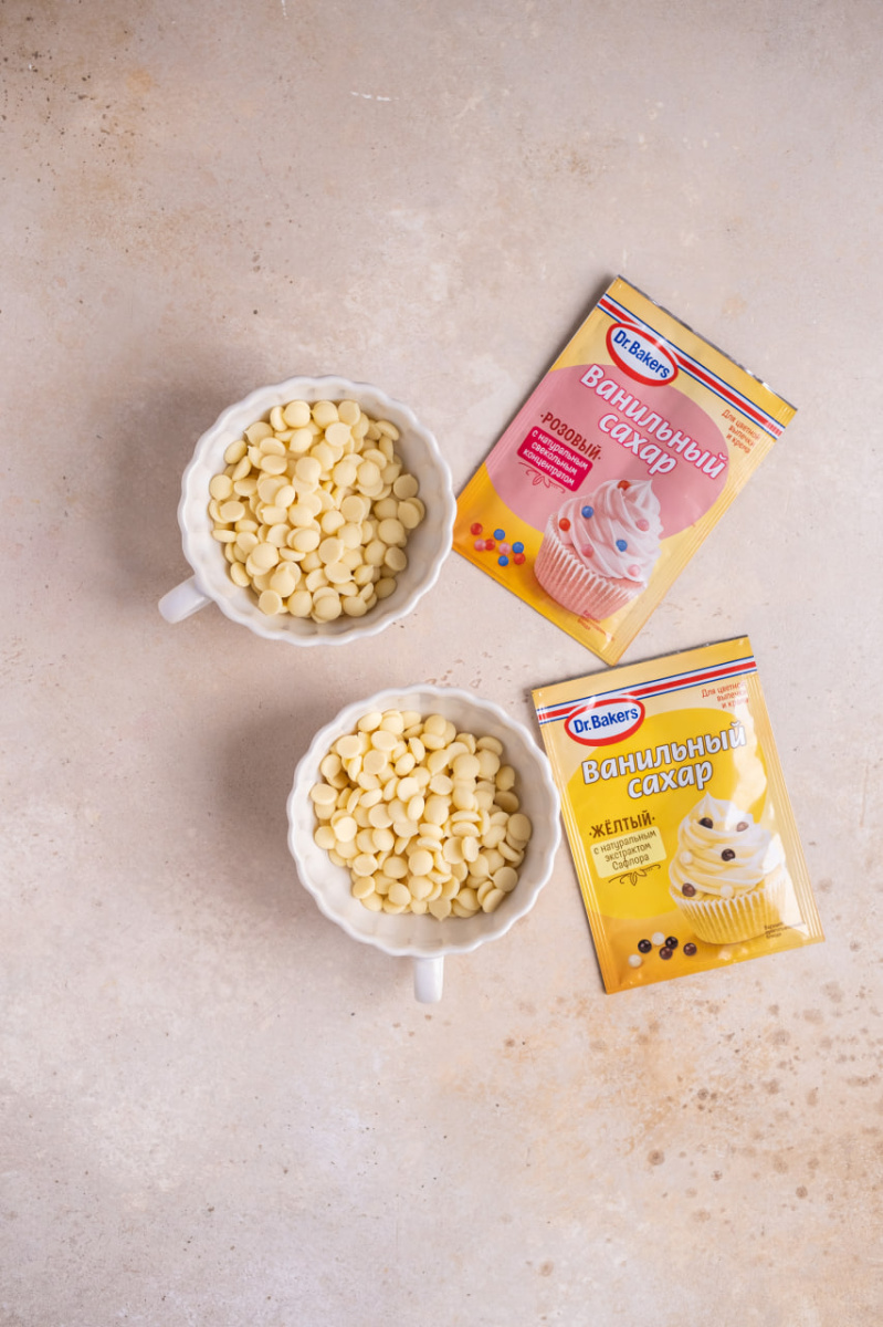 Для шоколадных корпусов рекомендуем брать шоколад в капсулах. Делим его (250 г) на две части (по 125 г). К одной добавляем розовый ванильный сахар (1 уп.), к другой — жёлтый (1 уп.). Ставим миску с шоколадом на водяную баню таким образом, чтобы миска не касалась воды. При постоянном помешивании растапливаем шоколад и ждём полного растворения красителя.