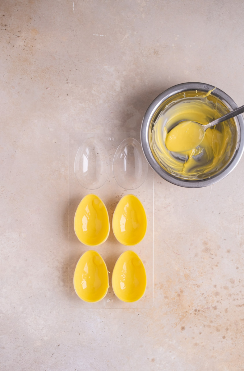 Заливаем растопленный шоколад в формы и распределяем его ровным слоем, вращая форму (или с помощью ложки). Для новичков рекомендуем брать силиконовую форму, из неё проще извлекать шоколад после застывания. Также подойдут пластиковые формы, как у нас. Понадобится две штуки по шесть ячеек или одна, но готовить корпуса придётся поочередно. Данного количества шоколада хватит на три жёлтых и три розовых яйца.