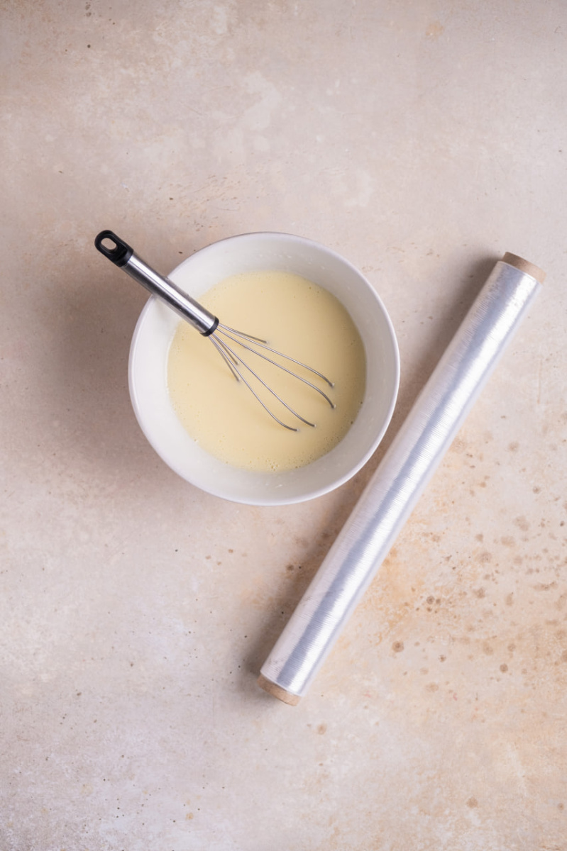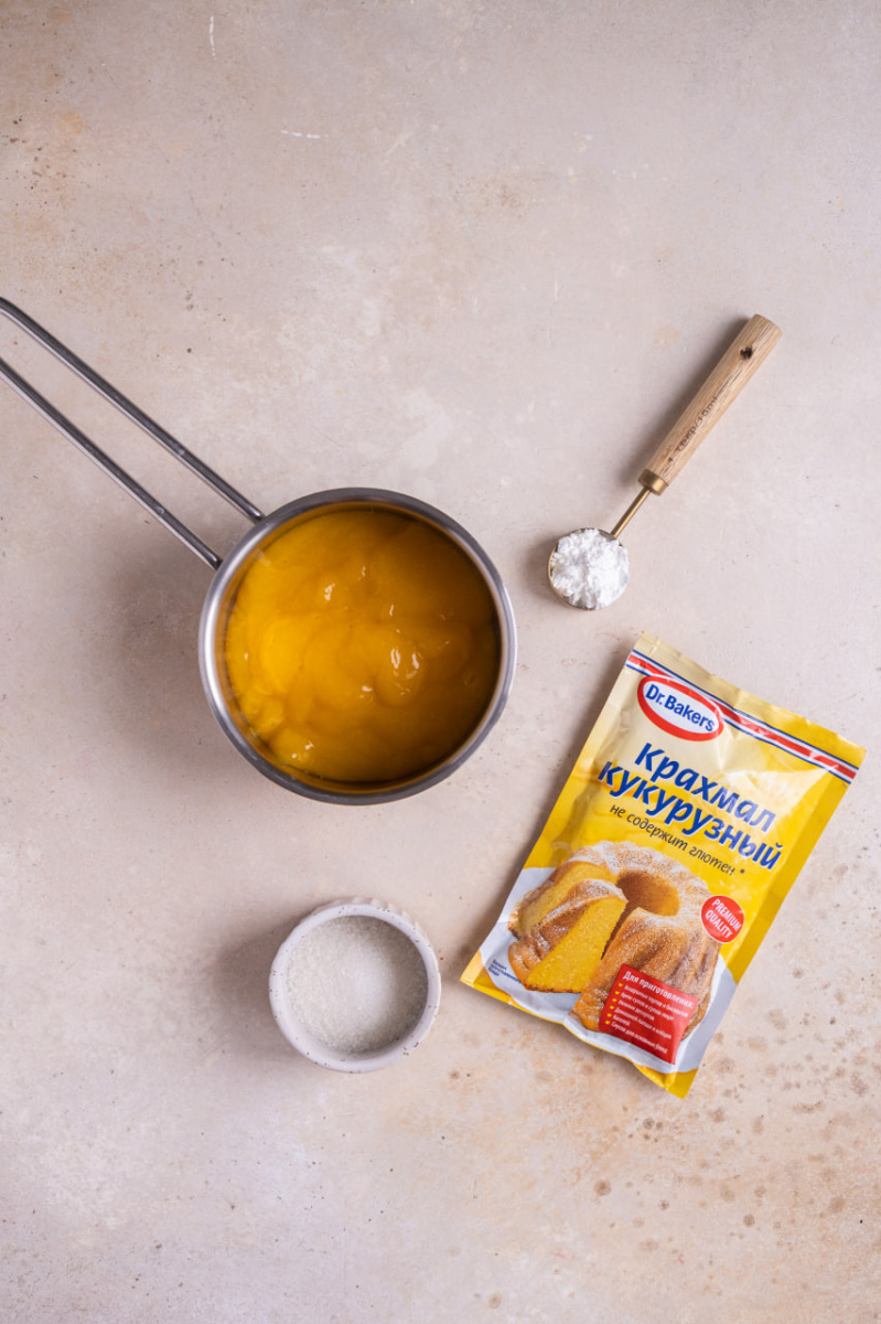 Для фруктовой начинки пюре из манго (160 г) соединяем с сахаром (20 г) и крахмалом (8 г) в сотейнике. Тщательно размешиваем с помощью венчика. Ставим на огонь, доводим до кипения и увариваем на среднем огне при постоянном помешивании до загустения, 1-2 минуты.