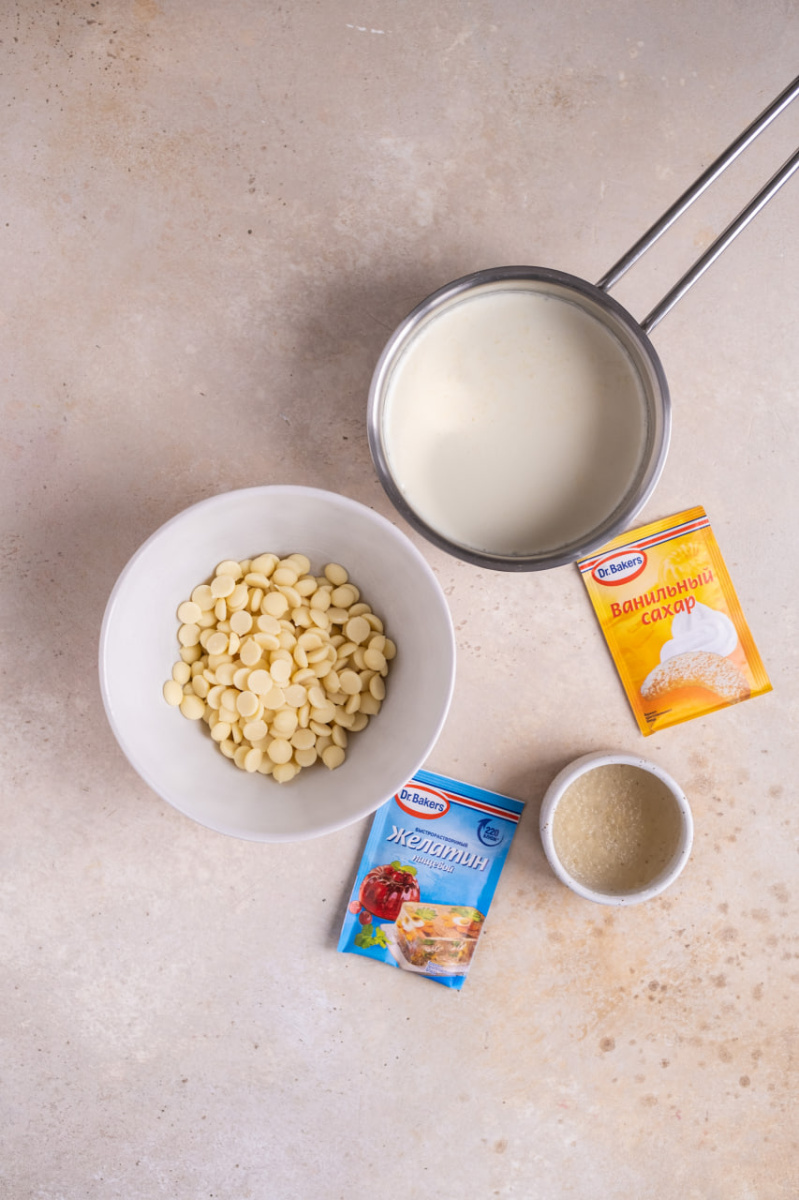 В миску с белым шоколадом (150 г) выливаем горячие сливки и размешиваем до полного растворения шоколада. Накрываем плёнкой в контакт и убираем в холодильник минимум на 8 часов.