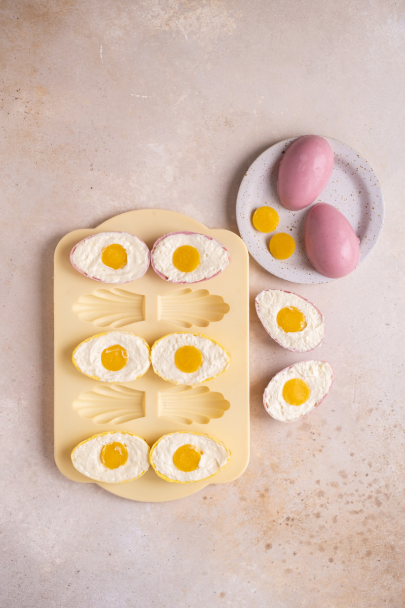 Приступаем к сборке десерта. Выкладываем шоколадные корпуса на мягкую поверхность (мы использовали силиконовую форму). Заполняем ванильным ганашем. В центр выкладываем фруктовую начинку и утапливаем её в креме, чтобы поверхность была ровной. Излишки ганаша снимаем ножом.