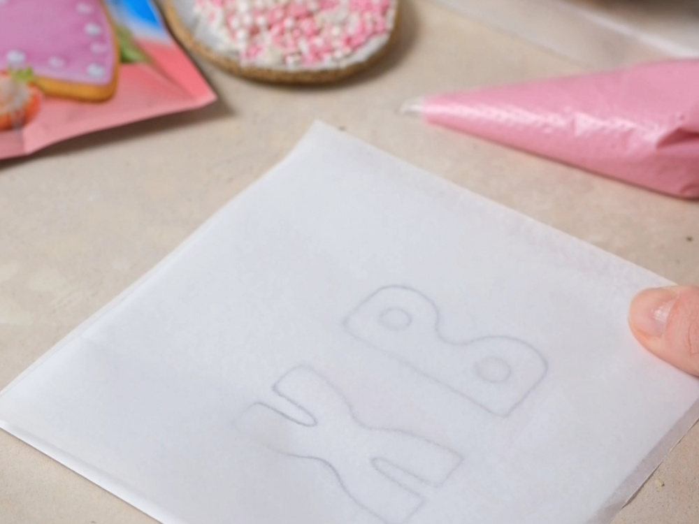 Распечатываем или рисуем шаблон букв. Вырезаем 10 квадратиков 15×15 см из силиконизированной пекарской бумаги.