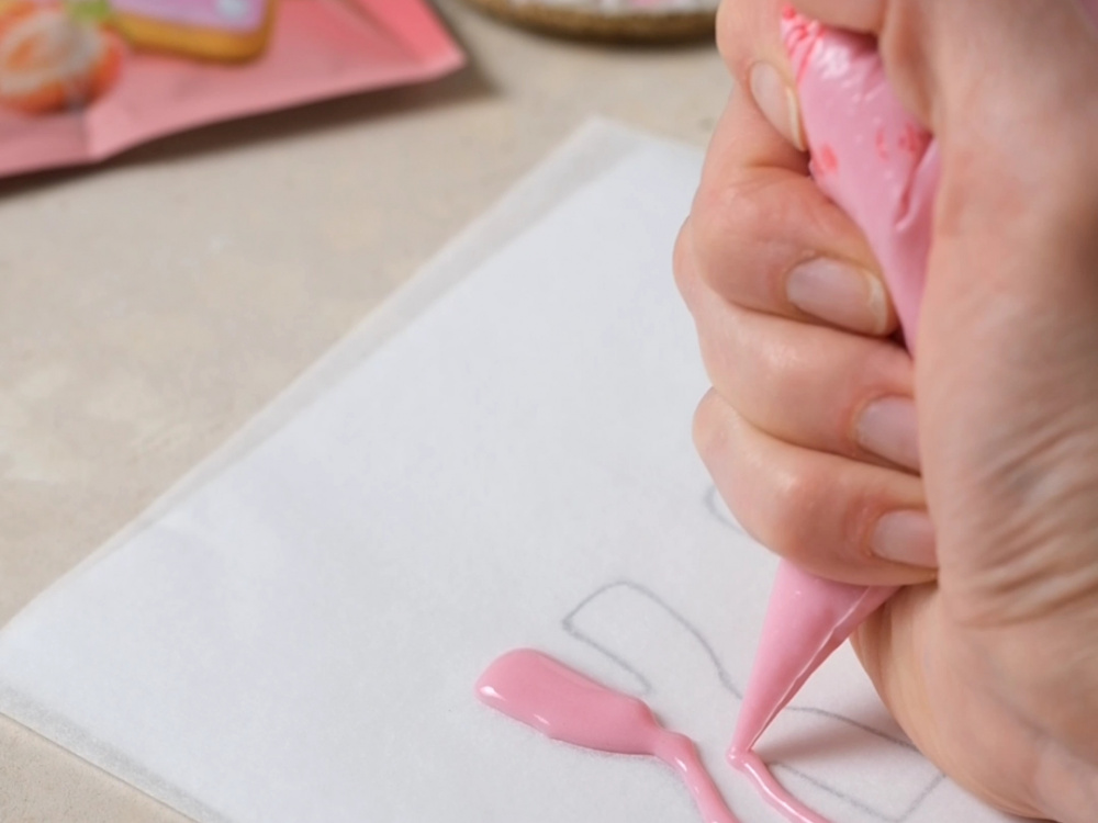 Пергамент накладываем поверх шаблона. Наносим глазурь по контуру букв и заполняем внутри.