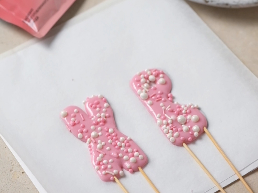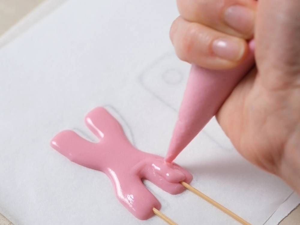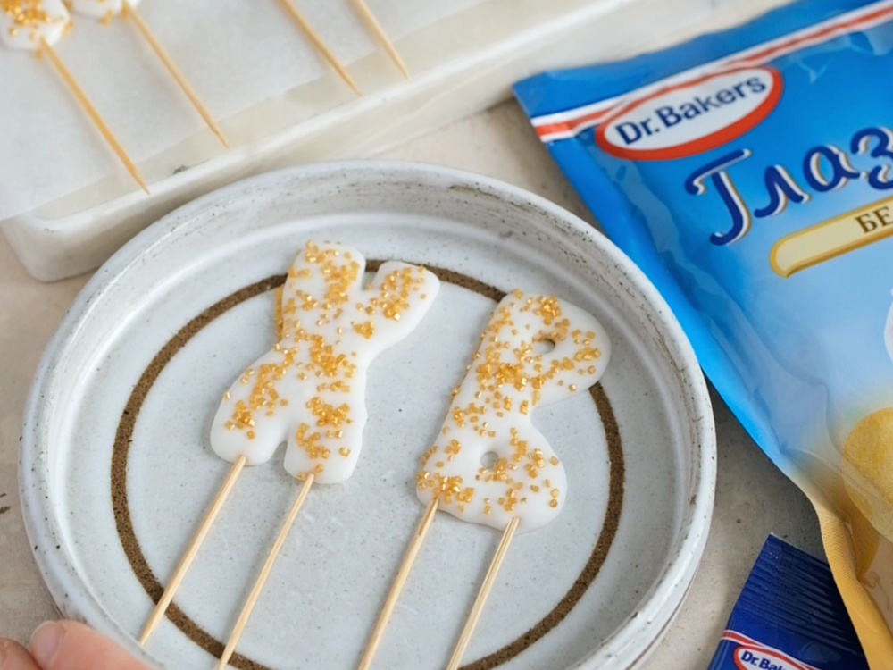 Крепим деревянные шпажки. Покрываем их сверху глазурью.