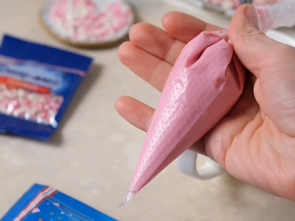 Глазурь разводим по инструкции на упаковке и перекладываем в маленький кондитерский мешок. Срезаем кончик.