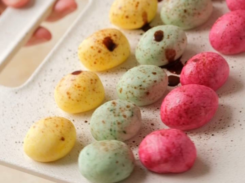 Отщипываем от массы кусочек размером с перепелиное яйцо или меньше. Скатываем в шарик и придаём форму яйца. Выкладываем на ровную поверхность.