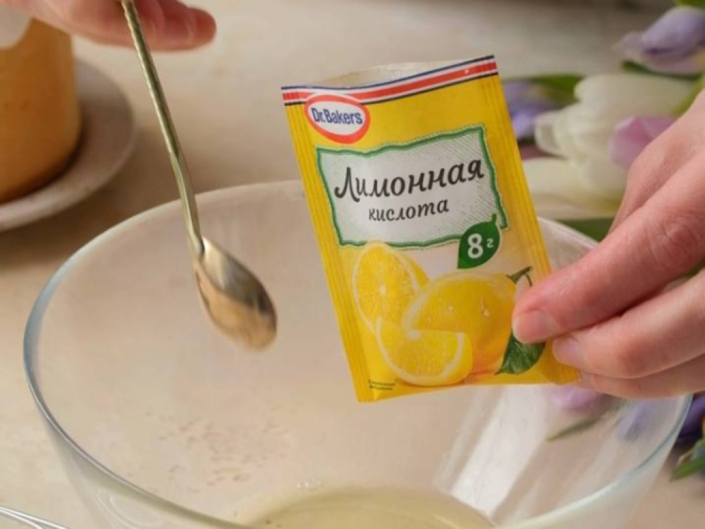 В яичный белок (20 г) добавляем лимонную кислоту (щепотку) и взбиваем до лёгкой пенки с помощью венчика.