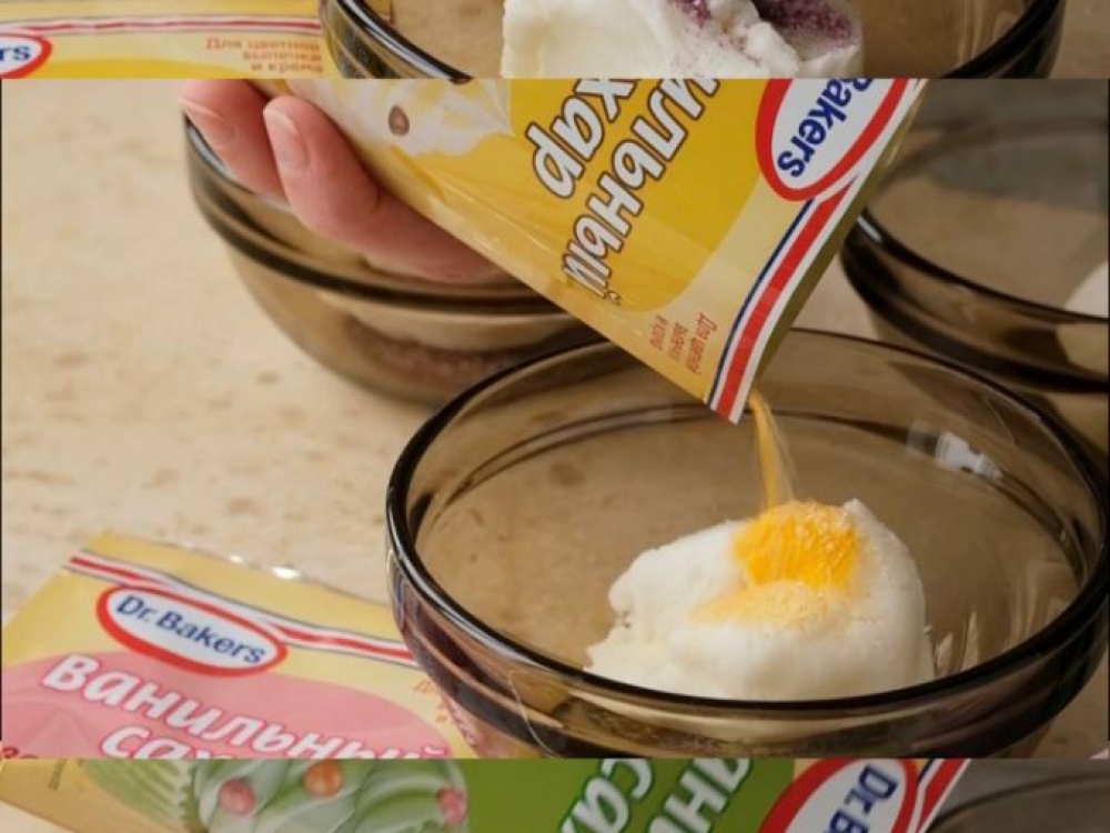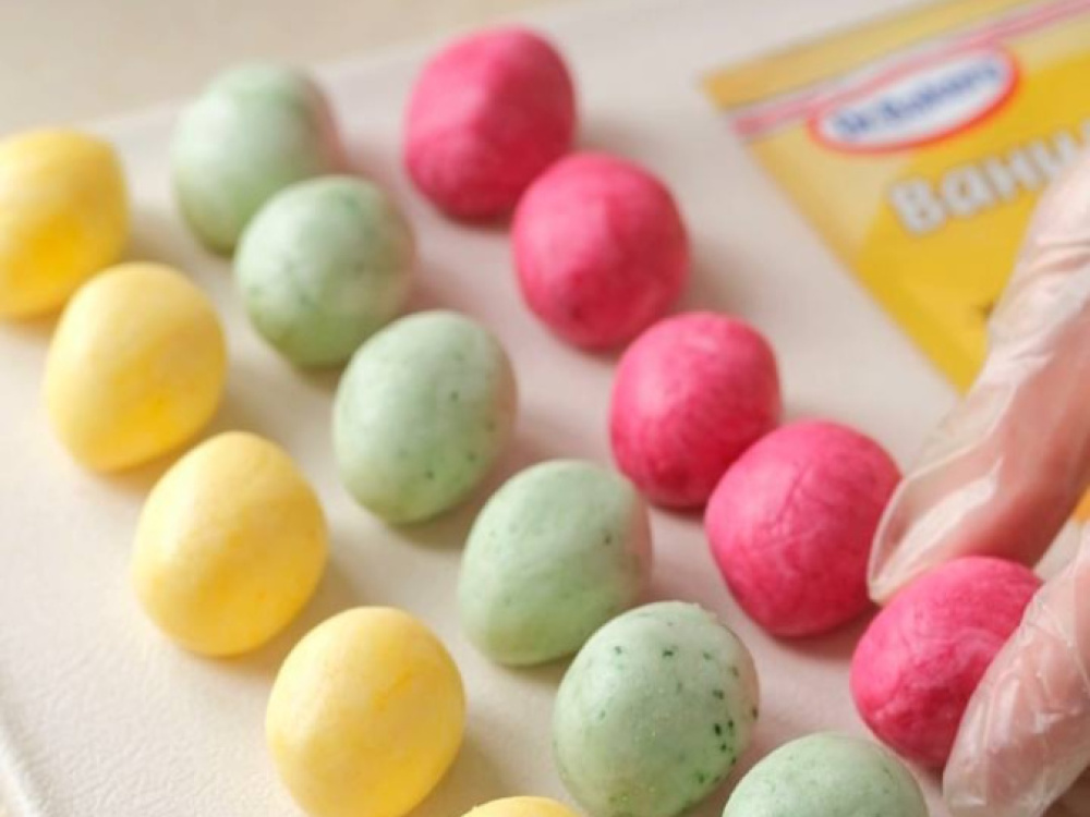 Делим массу на три части и добавляем в каждую цветной ванильный сахар (1/4 уп.). Вымешиваем до момента распределения красителя. Можно вымесить не до конца, чтобы получился мраморный эффект. Делать это лучше в перчатках.