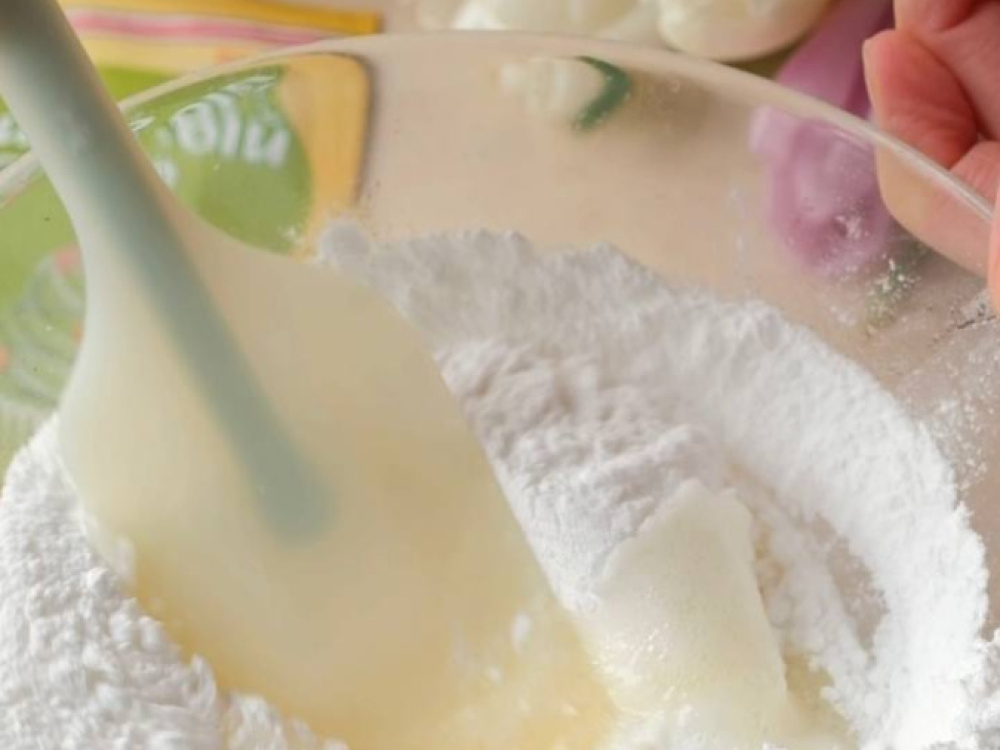 Всыпаем сахарную пудру (220 г) и смешиваем сначала с помощью лопатки, а затем вымешиваем руками до пластичного однородного состояния, около 1 минуты.
