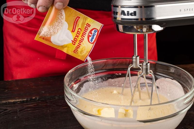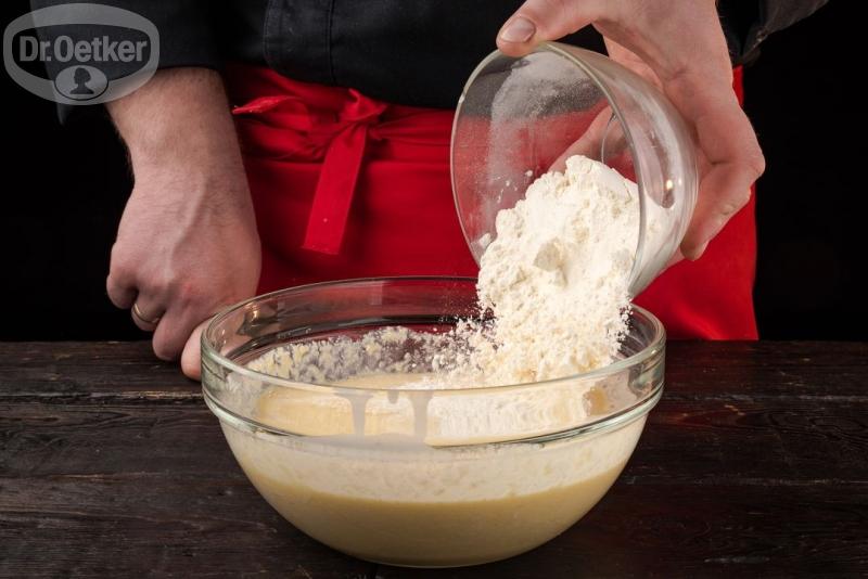 Соедините яйца, смесь с дрожжами, мягкое сливочное масло, соль. Добавьте ванильный сахар Dr. Oetker, хорошо размешайте.