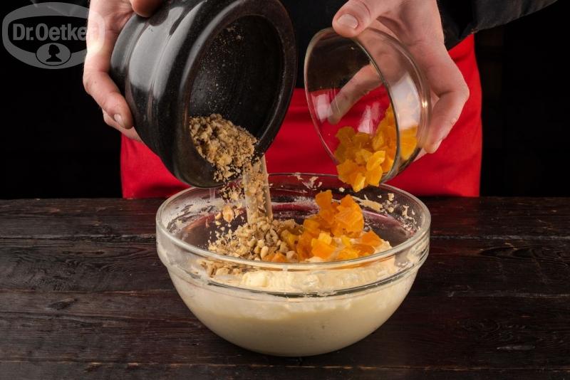 Вмешайте в тесто порезанную на кусочки курагу и измельченные орехи.