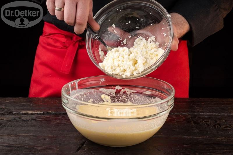 Протрите творог через сито. Смешайте с получившейся смесью.