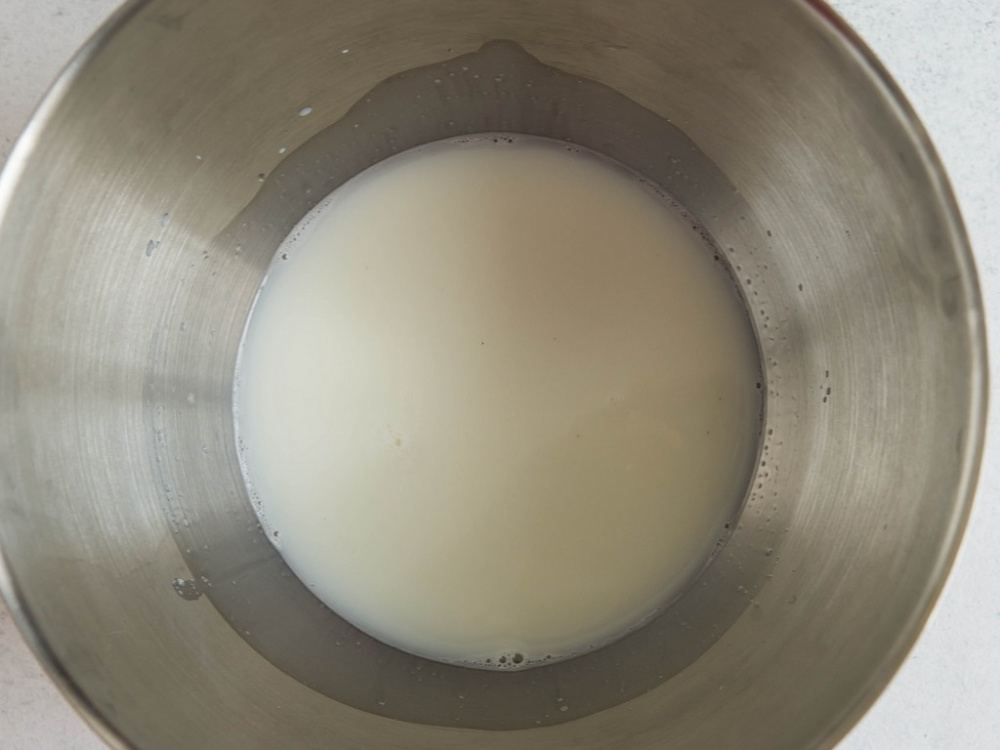 До того как приступить к приготовлению теста, промойте изюм и замочите его в тёплой воде на 15-20 минут. В чашу кухонной машины или в большую миску влейте подогретое молоко (помните, что оно не должно быть слишком горячим, не более 40°С), воду и добавьте сахар.