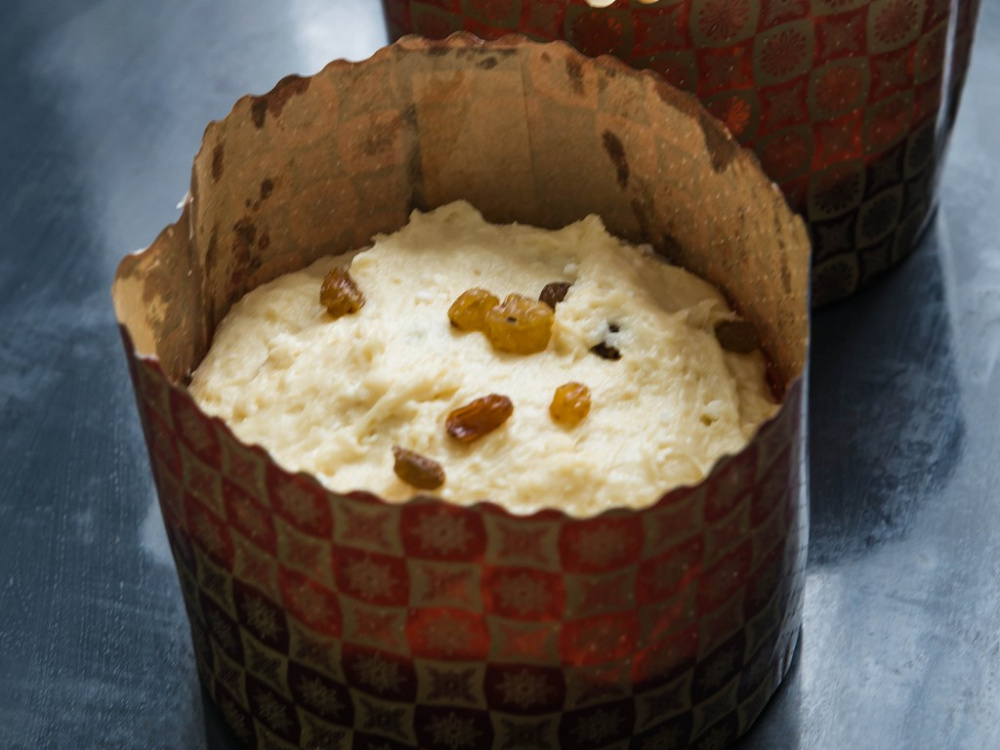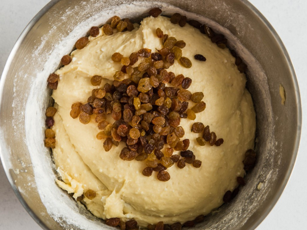 Когда тесто поднимется, обомните, добавьте изюм и перемешайте так, чтобы изюм равномерно распределился по всей массе теста. Снова поставьте в тёплое место подниматься примерно на 40 минут.