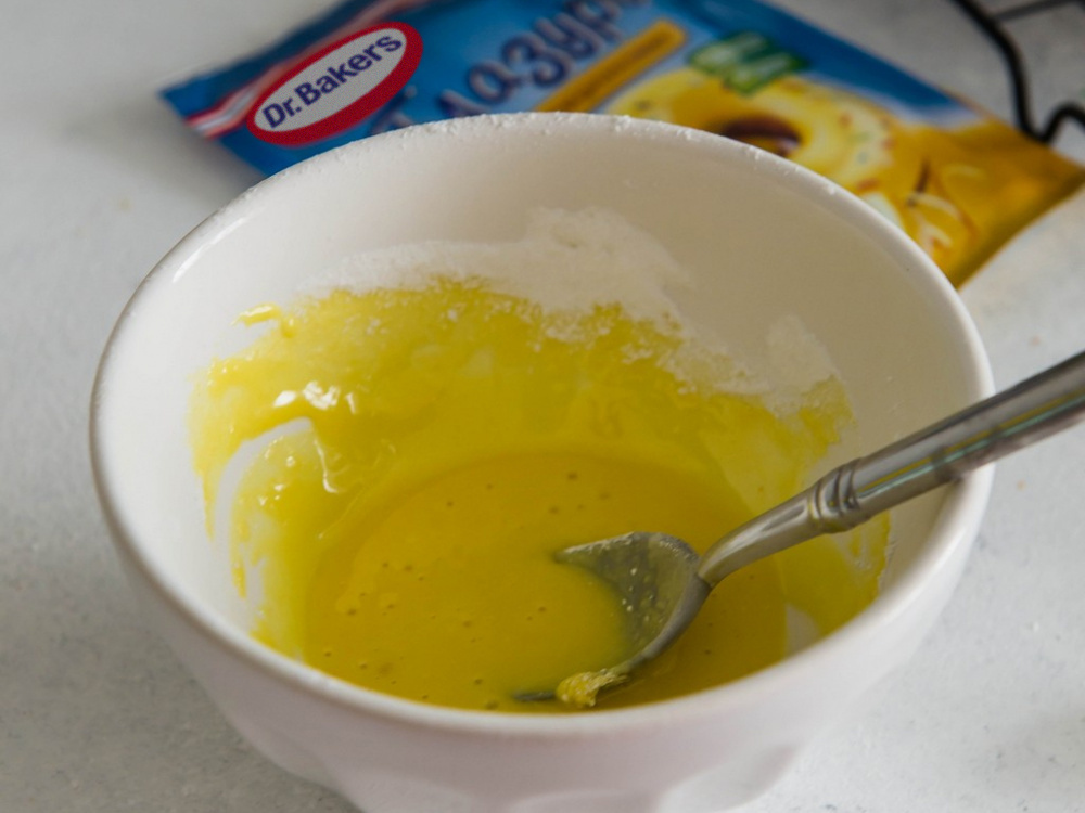 Для глазури смешиваем содержимое пакетика с 3-4 чайными ложками кипяченой водой или молока и доводим до консистенции густой сметаны.