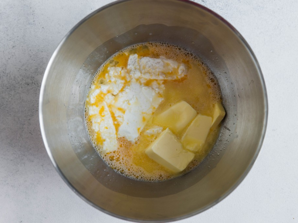 Разбейте туда же яйца, добавьте творог и размягченное сливочное масло (заранее достаньте его из холодильника, к моменту добавления в тесто масло должно быть таким мягким, что при лёгком нажиме на нём остаётся след). По рецепту, творог лучше взять мелкозернистый. Если у вас рассыпчатый творог с крупным зерном, то протрите его через сито или пробейте погружным блендером. Перемешайте все ингредиенты до однородности.