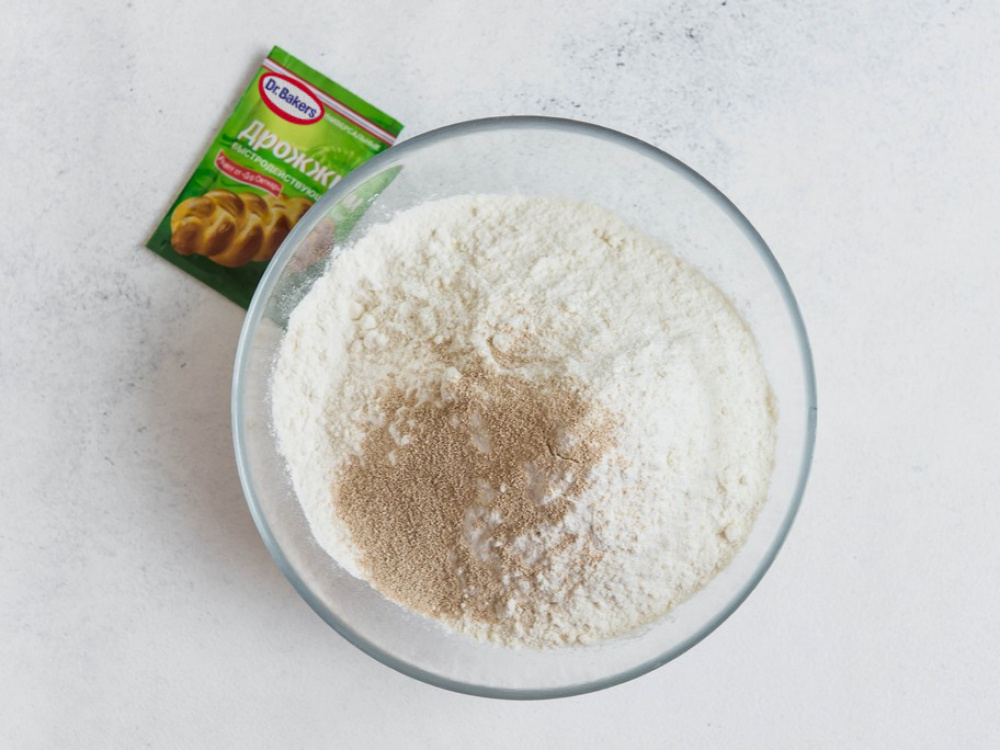 В отдельную емкость просейте муку, добавьте к ней пакетик дрожжей и перемешайте, чтобы дрожжи равномерно распределились. Оставьте на 10 минут.