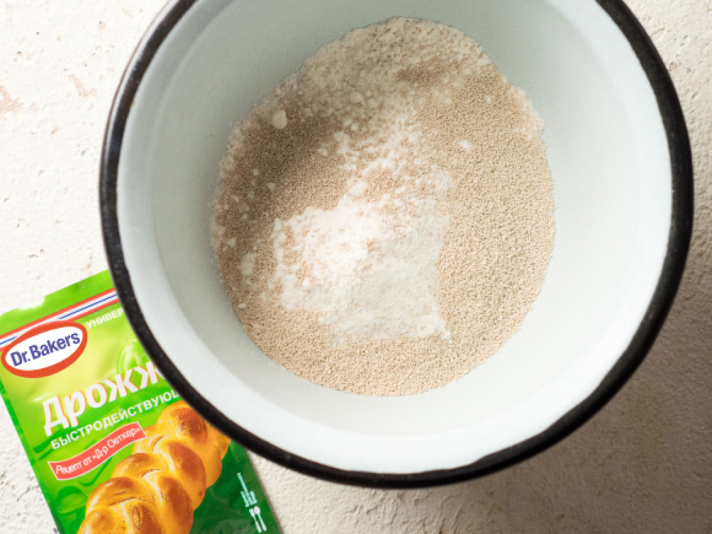 Для приготовления теста в глубокую ёмкость просеиваем пшеничную муку высшего сорта, добавляем к ней пакетик дрожжей Dr. Bakers, перемешиваем и оставляем на 10-15 минут для лучшего объединения.