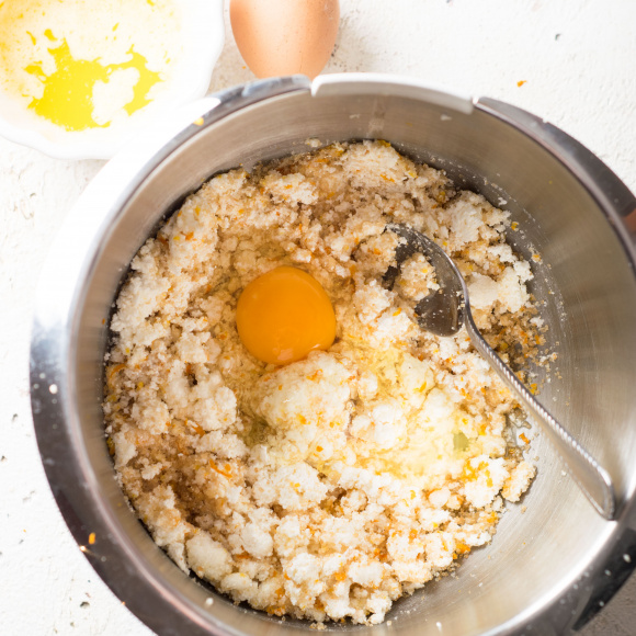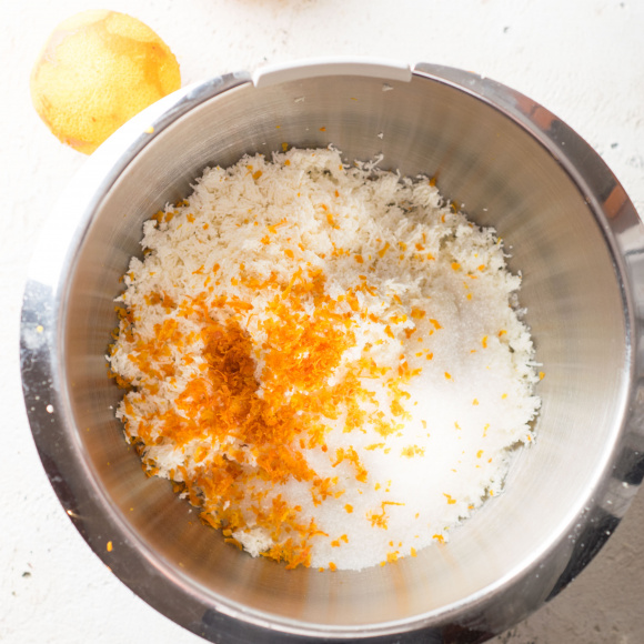Творог протираем через сито либо пробиваем погружным блендером до пастообразного состояния. При помощи тёрки аккуратно снимаем с апельсинов цедру. Добавляем сахар и цедру в творог и тщательно перемешиваем.