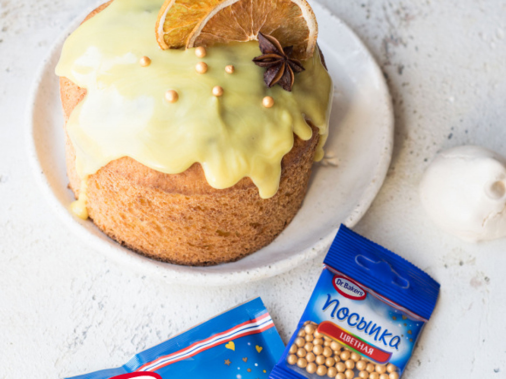 Пакетик с глазурью со вкусом цитрусовых Dr. Bakers помещаем в горячую воду на 3-5 минут, затем срезаем уголок пакетика и украшаем готовой глазурью остывшие куличи. Поверх глазури посыпаем куличи кусочками сушеных цитрусов и цветной посыпкой Dr. Bakers.