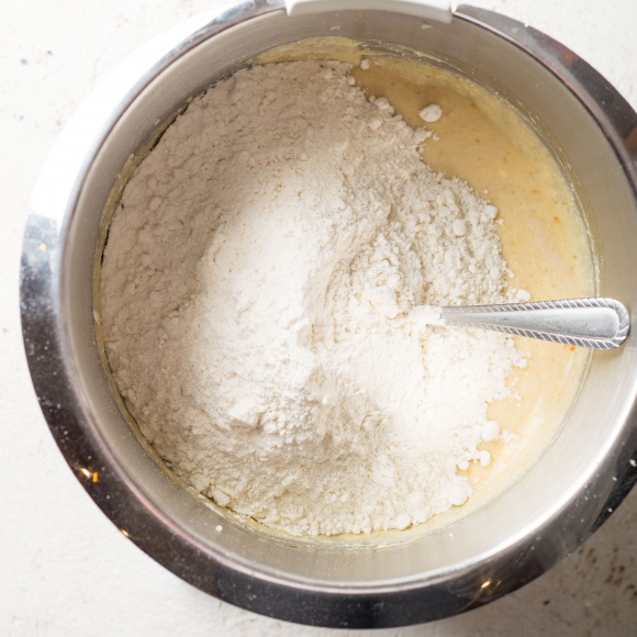 Подошедшую опару добавляем к творожной массе и слегка перемешиваем венчиком. Небольшими порциями вводим в творожную массу просеянную муку и замешиваем липкое тесто.