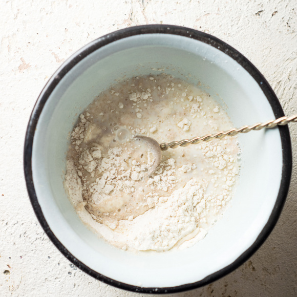 Молоко разогреваем до температуры 35-40 градусов, аккуратно вливаем в мучную смесь, добавляем сахарный песок, после чего перемешиваем смесь венчиком. Накрываем ёмкость с опарой полотенцем и оставляем в тёплом месте на 30 минут.