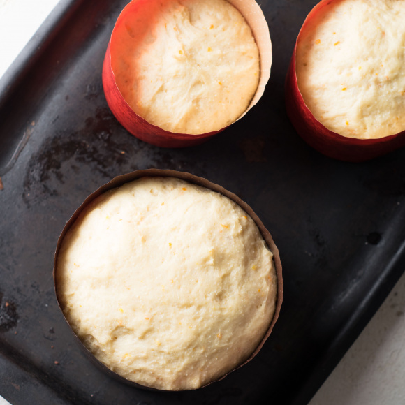 Формы для куличей смазываем растительным маслом и посыпаем мукой. Слегка обминаем подошедшее тесто и раскладываем его по формам, заполняя при этом 1/2 от их объема. Накрываем формы полотенцем и оставляем для расстойки теста ещё на 30 минут.