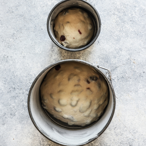 Смазываем руки сливочным маслом, разделяем тесто на две части, аккуратно формируем колобки и перекладываем в формы.