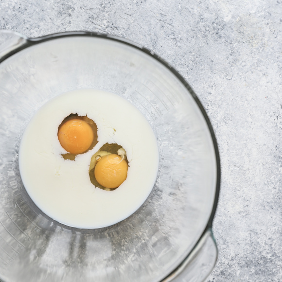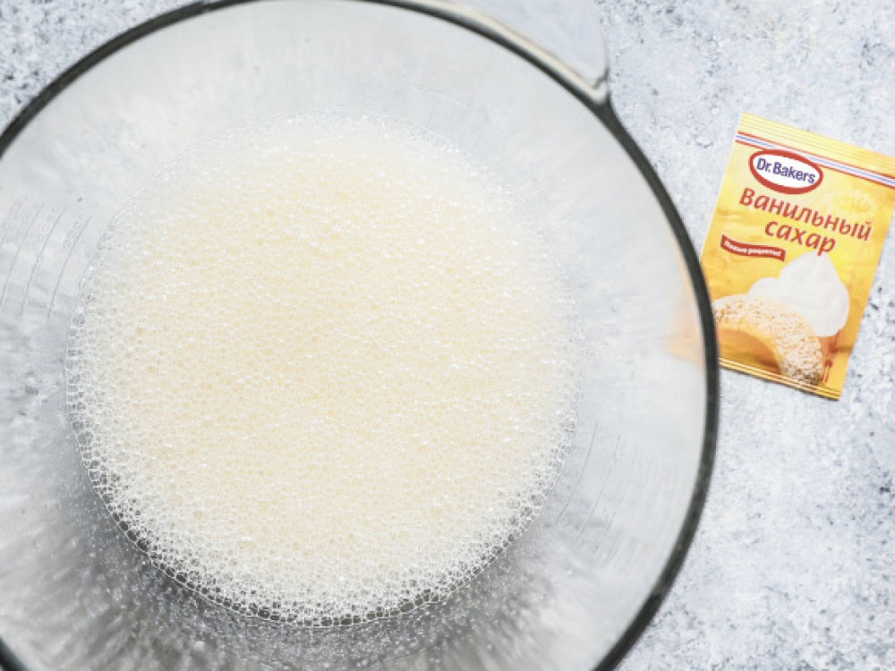 Яйца взбиваем с сахаром, ванильным сахаром и молоком, добавляем творог и ещё раз хорошо взбиваем.