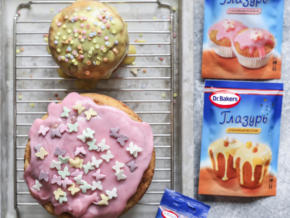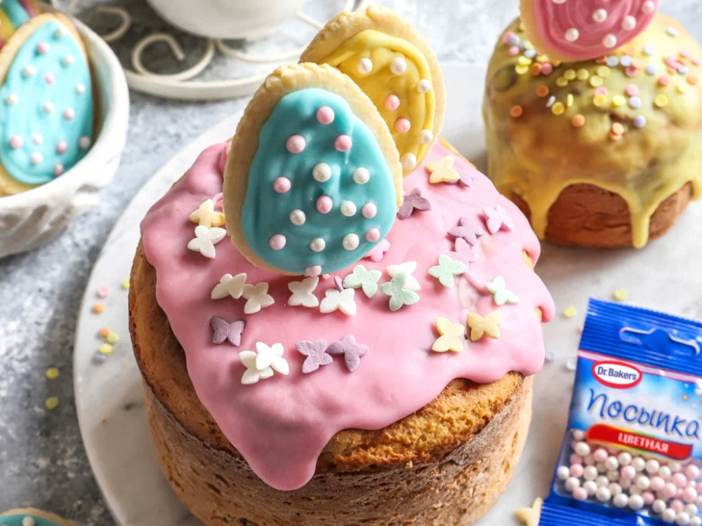 Куличи украшаем таким же способом: Сахарные глазури прогреваем в воде (80 градусов) 6 минут, срезаем кончик и наносим глазурь на кулич, посыпаем кондитерскими посыпками.