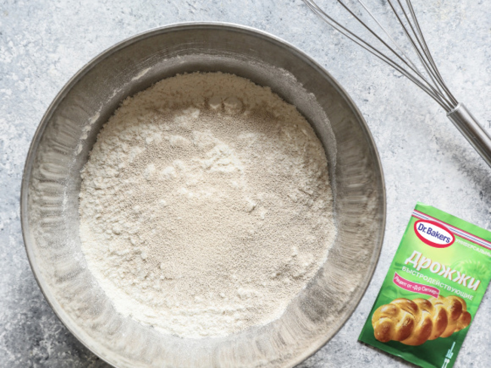 Муку просеиваем вместе с дрожжами и перемешиваем. Творог превращаем в однородную массу с помощью блендера.