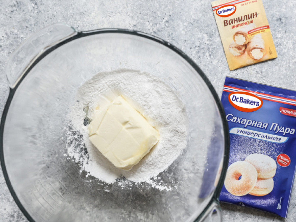 Для пасхального печенья мягкое масло взбиваем с сахарной пудрой и ванилином.