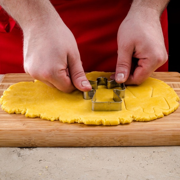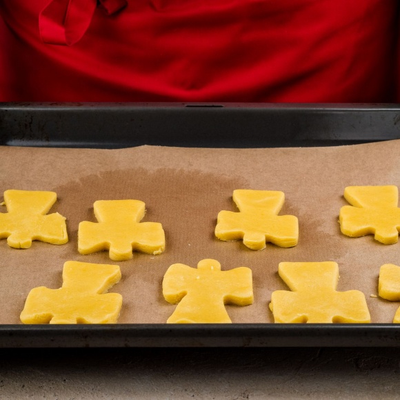 Раскатайте тесто в пласт не толще 1 см. Вырежьте печенье, используя формочки.