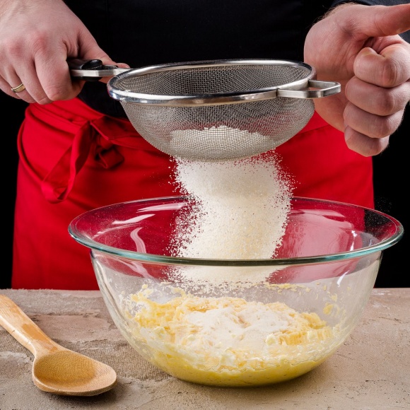 Взбейте массу миксером на средней скорости. Затем всыпьте половину просеянной муки и снова взбивайте, пока тесто не приобретет нежную текстуру.
