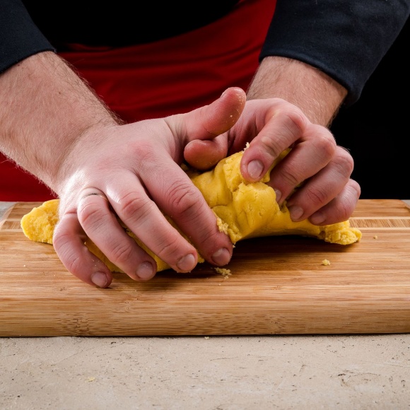 Всыпьте оставшуюся муку и замесите тесто руками, пока оно не станет плотным и эластичным. Заверните тесто в пищевую пленку и поставьте на полчаса в холодильник.