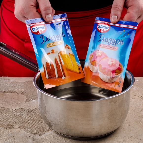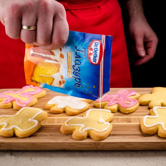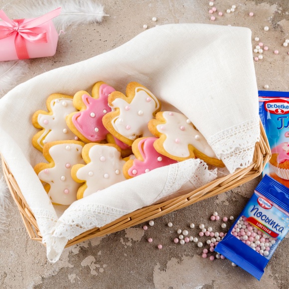 Достаньте печенье из духовки и остудите. Приготовьте сахарную белую и розовую глазурь Dr. Oetker. Опустите пакетики с глазурью в горячую воду на 3–5 минут. Выложите их на полотенце и слегка надавите на них. чтобы сделать текстуру глазури более однородной.